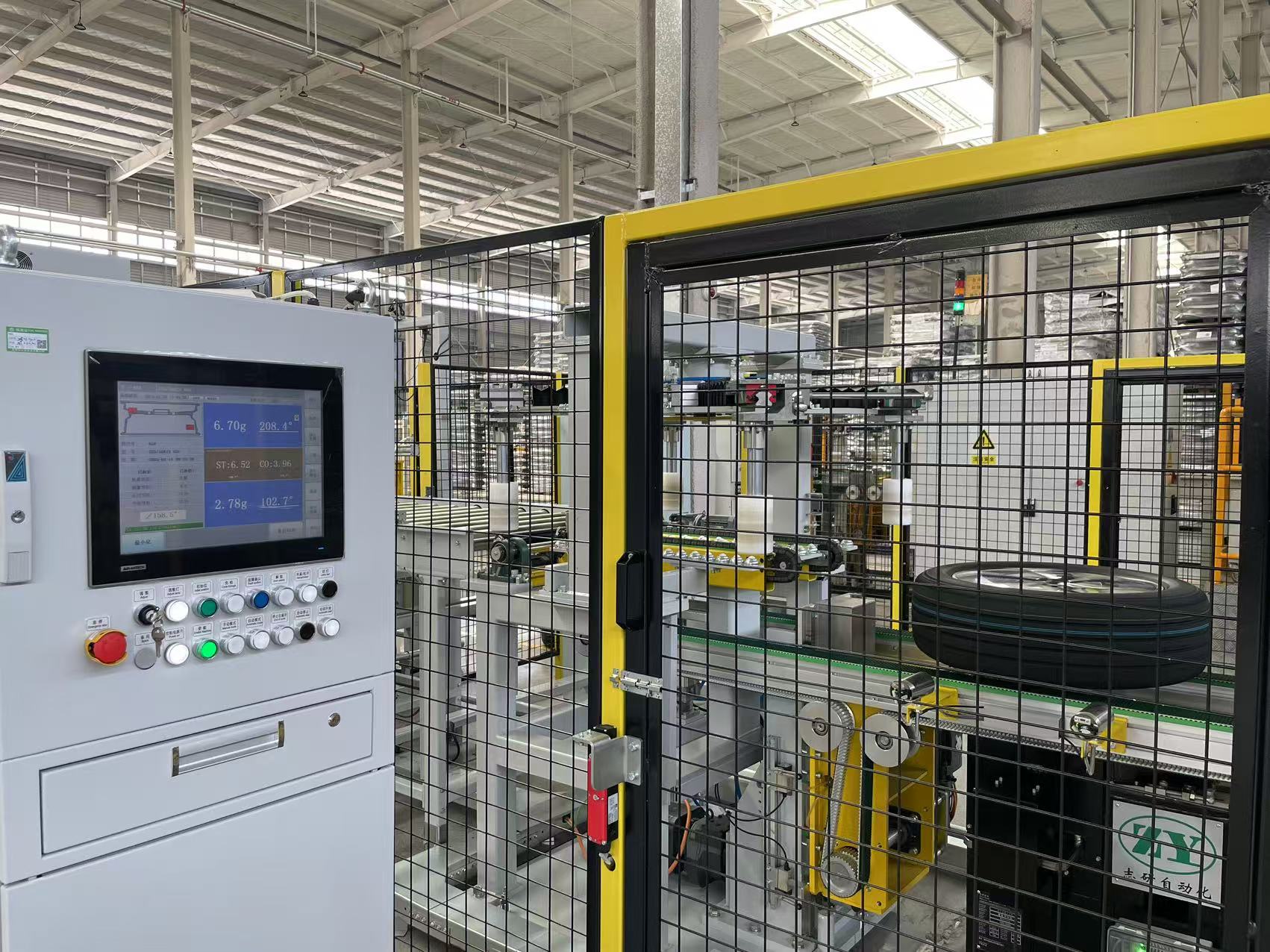 1.输送机构送入轮胎,抱中后,输送到主轴检测工位;